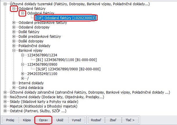 V okne Číslovanie dokladov sa nachádza stromová štruktúra, ktorá má viacero úrovní: