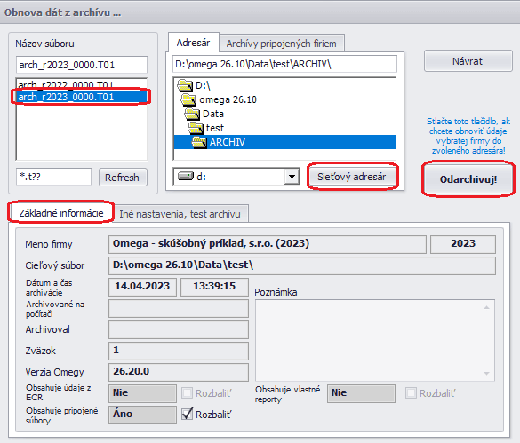 - Po správnom nastavení môžeme spustiť obnovu dát pomocou voľby Odarchivuj. Po ukončení tejto funkcie sa zobrazí správa o úspešnej obnove dát. Ak sa obnovovaná firma nenachádza v zozname pripojených firiem, program na záver ponúkne jej pripojenie.