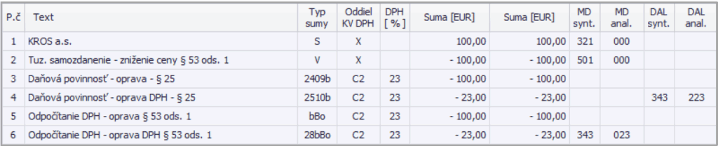 Došlý dobropis zaúčtujeme v okruhu DD – Došlé dobropisy pomocou automatického účtovania 29/1 DD – Tuz. samozdanenie – §53 ods. 1 (dobropis). Keďže na pôvodnej faktúre sme tiež účtovali so samozdanením, rovnaký princíp uplatníme aj pri dobropise. V rozpise DPH uvedieme sumu do Neobsahuje DPH. V záložke Evidencia DPH doplníme číslo pôvodného dokladu.