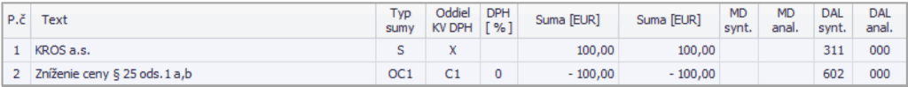 Odoslaný dobropis zaúčtujeme v okruhu OD – Odoslané dobropisy pomocou automatického účtovania 19 OD – Oprava základu §25 od.1 a,b (dobropis). Sumu rovnako ako na pôvodnej faktúre uvedieme v Rozpise DPH do bunky Nulová DPH a typ sumy nastavíme na OC1. V záložke Evidencia DPH doplníme číslo pôvodného dokladu.
