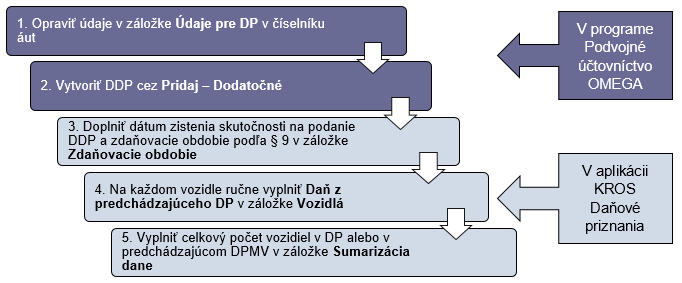 V programe Podvojné účtovníctvo OMEGA cez menu Číselník – Autá opravíme dané vozidlo – v záložke Údaje pre DP opravíme dátum prvej evidencie vozidla na 1. 6. 2021. Následne vytvoríme DDP cez menu Prehľady – Daň z motorových vozidiel, kde pri voľbe Pridaj vyberieme možnosť Dodatočné. Program nás automaticky presmeruje do aplikácie KROS Daňové priznania, kde po prihlásení vykonáme ďalšie ručné úpravy.