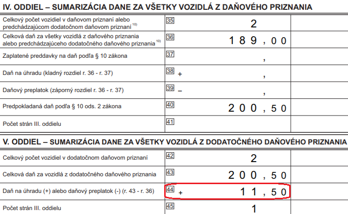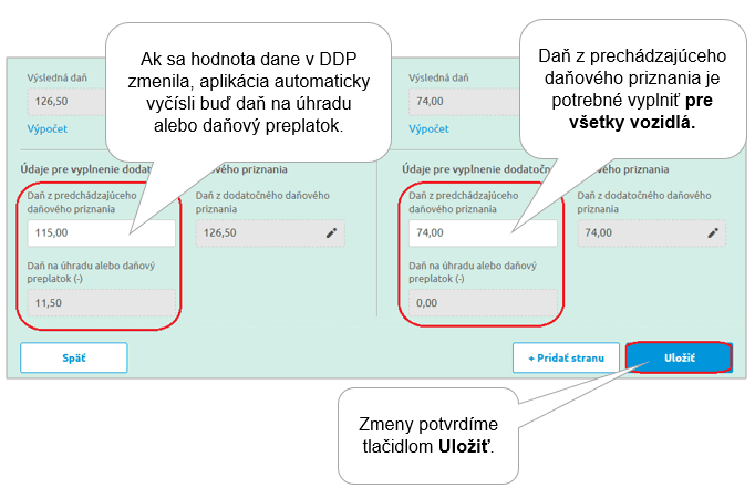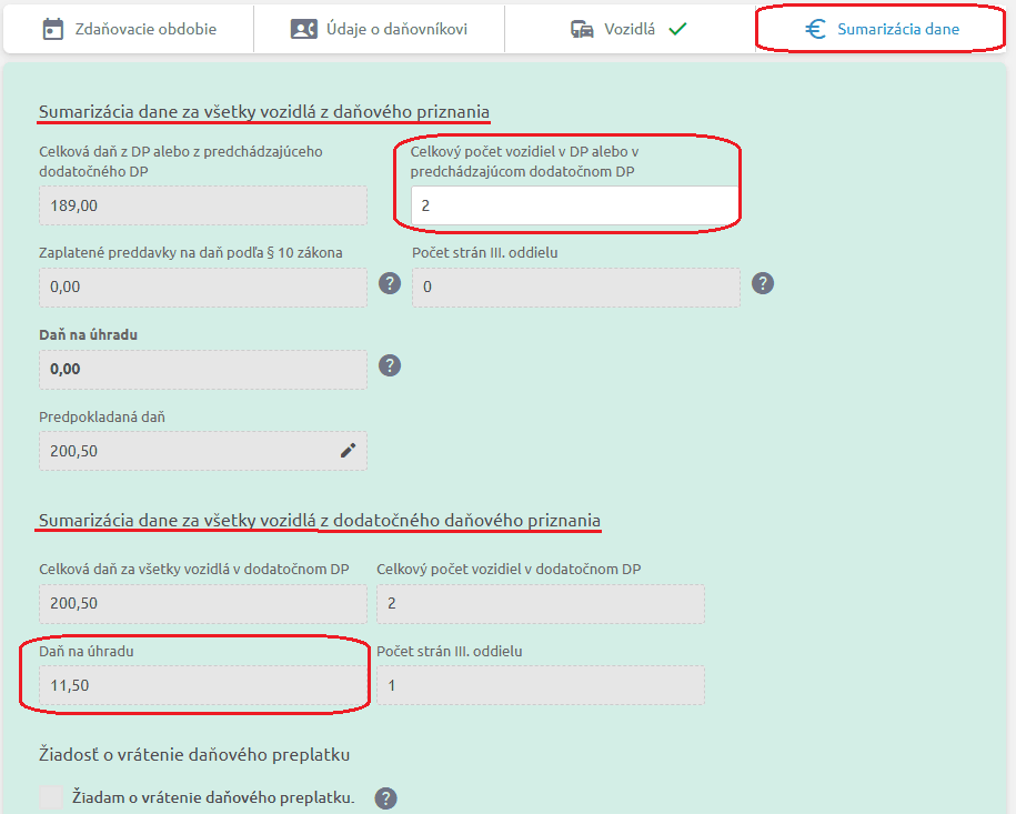 Do bunky „Predpokladaná daň“ aplikácia automaticky doplní výšku predpokladanej dane z dodatočného daňového priznania a prenesie do riadku 40 DDP. Podľa poučenia k vyplneniu daňového priznania sa v riadku 40 uvedie tá istá suma, ako bola uvedená v priznaní, to sa nevzťahuje na podané DDP, ktoré opravuje nesprávny údaj v tomto riadku. V časti Sumarizácia dane za všetky vozidlá z dodatočného daňového priznania aplikácia automaticky vyplní údaje „Celková daň za všetky vozidlá v dodatočnom DP“ (riadok 43 daňového priznania), Daň na úhradu/daňový preplatok“ (riadok 44 daňového priznania), „Celkový počet vozidiel v dodatočnom DP“ (riadok 42 daňového priznania) a „Počet strán III. oddielu“ riadok 45 daňového priznania.
