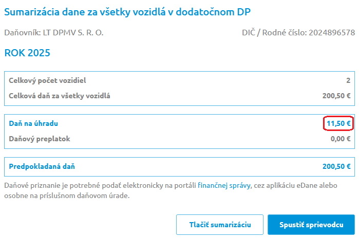 Po kontrole a uložení všetkých záložiek aplikácia vygeneruje sumarizáciu dane za všetky vozidlá v DDP, kde vyčísli celkovú hodnotu dane na úhradu.