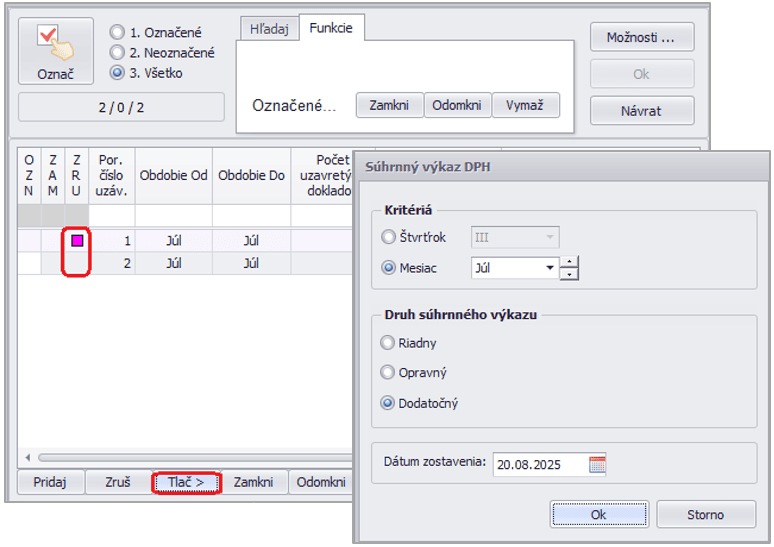Po oprave dokladov uzávierku SV DPH vytvoríme znovu, budeme mať tak za príslušné obdobie 2 uzávierky a pri tlači si zvolíme voľbu – Dodatočný.