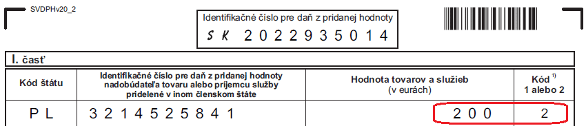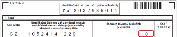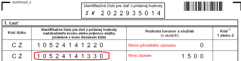 V dodatočnom SV DPH sa v prvom riadku uvedie stornovaný nesprávny záznam (nesprávne IČ DPH) s hodnotou „0“ v stĺpci Hodnota tovarov a služieb a s kódom uvedeným rovnako, ako bol uvedený v riadnom SV DPH – v našom prípade pre tovar bez kódu. V druhom riadku sa uvedie správny záznam s hodnotou a kódom ako v riadnom SV DPH.