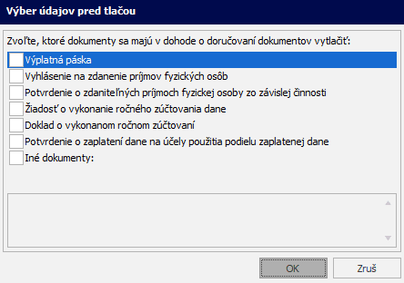 Túto dohodu nájdete cez menu Tlač – Tlač – Personalistika – Písomné dokumenty pracovníkov – Dohoda o elektronickom doručovaní. Pred tlačou je možnosť zvoliť si, ktoré dokumenty majú byť v dohode obsiahnuté. Po označení voľby Iné dokumenty, si môžete dopísať ďalšie vlastné dokumenty.