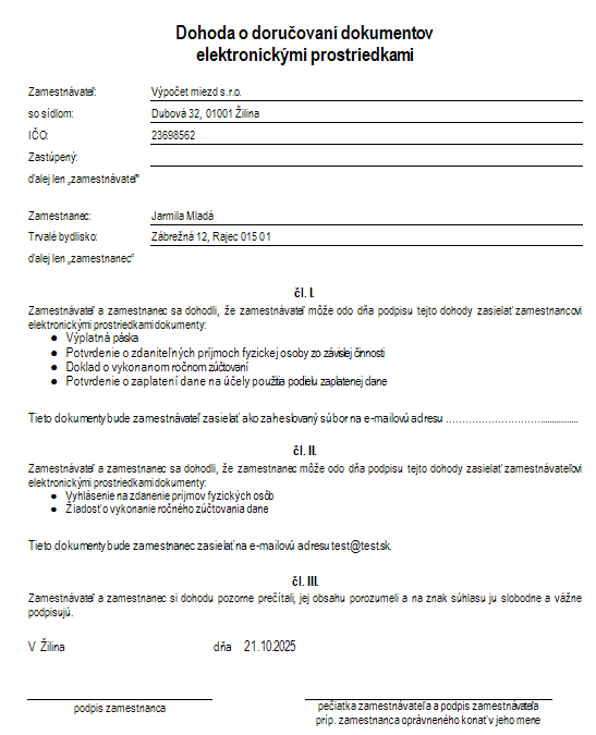 prostriedkami. Slúži na uzatvorenie dohody medzi zamestnancom a zamestnávateľom o doručovaní dokumentov elektronickými prostriedkami.