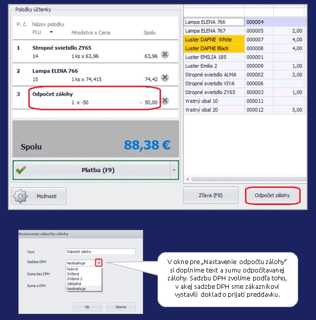 V programe OMEGA vytvoríme predajku, ktorú naplníme položkami. Následne preddavok odpočítame pomocou tlačidla Odpočet zálohy.