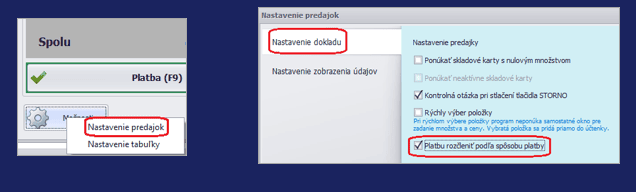 Každý užívateľ (pokladník) si môže nastaviť spôsob rozčlenenia platby (na hotovosť, karta a šek) priamo v predajke cez Možnosti – Nastavenie predajok.