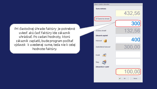 V programe OMEGA je pri úhradách odoslaných faktúr k dispozícií funkcia ,,Čiastočná úhrada“. Po zakliknutí tejto funkcie je možné zaevidovať len čiastočnú úhradu a faktúru uhradiť na viackrát.