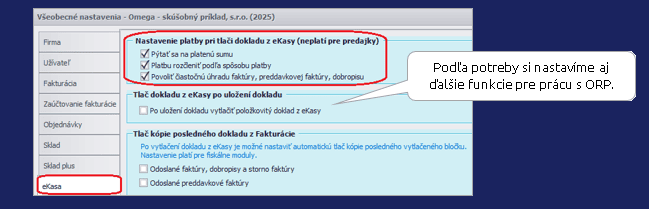V menu Firma – Nastavenie – Všeobecné nastavenia v záložke eKasa nájdeme nastavenia pre prácu s ORP. V časti Nastavenie platby pri tlači dokladu z eKasy je možné nastaviť, aby sa program pri tlači dokladu spýtal na platenú sumu (pre odoslané faktúry a dodacie listy), ako aj rozčlenenie platby podľa spôsobu platby, tzn. či je doklad uhradený v hotovosti, kreditom alebo šekom. Tiež tu môžeme povoliť čiastočnú úhradu faktúry, preddavkovej faktúry a dobropisu.