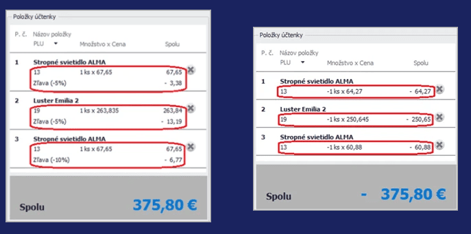 Zľava za položku – ak sme na pôvodnom doklade použili zľavu na položke a k tomuto dokladu vytvárame vrátenie, do dokladu vrátenia sa automaticky prenáša cena po zľave. Údaj o výške a percente zľavy sa do dokladu neprenáša a výšku zľavy nie je možné zmeniť. Meniť môžeme iba predajnú cenu a množstvo.