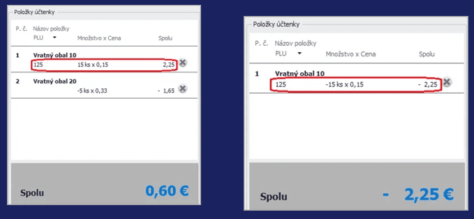 - ak na pôvodnom pokladničnom doklade je vratný obal v kladnej hodnote (ide o predaj), tak v prípade vrátenia sa prenášajú vratné obaly v zápornej hodnote,