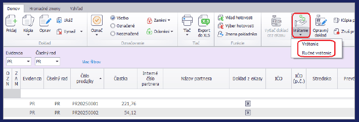 Pokladničný doklad Vrátenie vytvoríme dvoma spôsobmi: