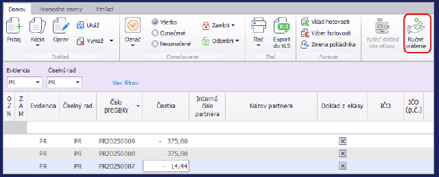 Funkcia Ručné vrátenie slúži na vytvorenie vrátenia k dokladom, ktoré sa nenachádzajú v programe Podvojné účtovníctvo OMEGA, alebo boli vytvorené v minulých rokoch alebo boli vystavené pred systémom e-kasa.