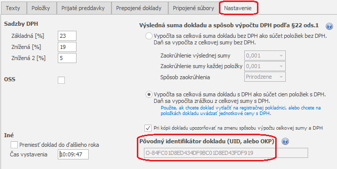 Pri evidovaní dokladu Vrátenie pomocou dodacích listov sa pôvodný identifikátor dokladu nachádza v záložke Nastavenie.