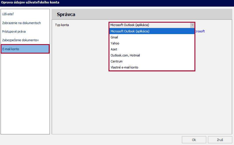 Ak MS Outlook nemáte a chcete posielať výplatné pásky e-mailom, svoj e-mail zaregistrujete v programe Mzdy a personalistika OLYMP cez menu Nastavenia – Užívatelia po vstupe cez Oprav na užívateľa, ktorý bude výplatné pásky posielať. Na karte E-mailkonto z rozbaľovacieho poľa vyberiete, ktorý typ konta používate.