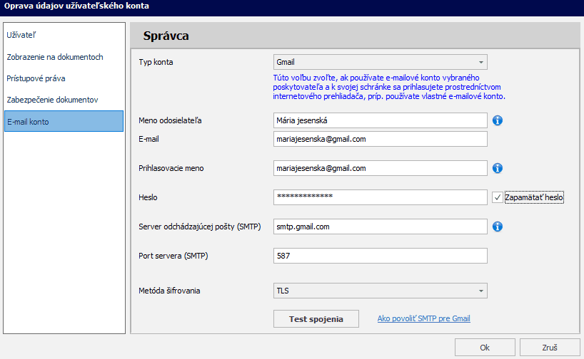 Po vyplnení údajov kliknite na tlačidlo Test spojenie, ak sú údaje správne môžete prejsť na odosielanie výplatných pások e-mailom.