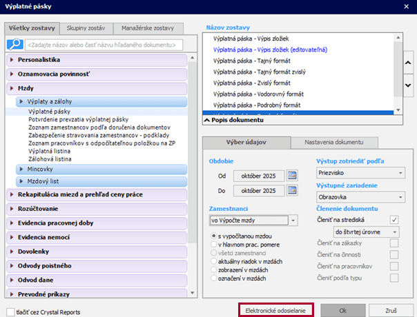 Ak chcete zamestnancom odoslať napr. výplatné pásky e-mailom, odošlete ich cez Tlač – Tlač – Mzdy – Výplaty a zálohy, vyberiete si výplatnú pásku, ktorú chcete odoslať, zvoľte obdobie a okruh zamestnancov a kliknite na voľbu Elektronické odosielanie.