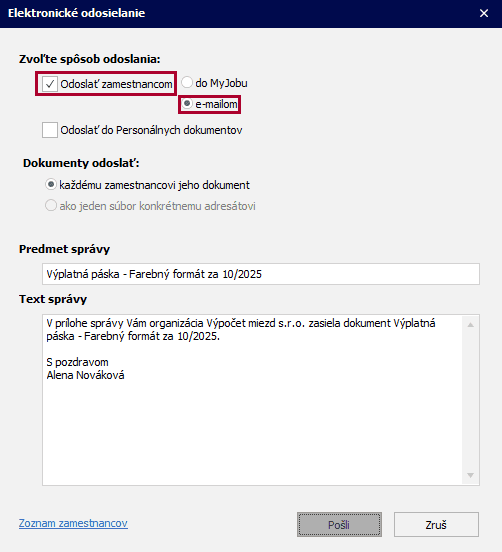 Po kliknutí na túto voľbu sa zobrazí formulár, v ktorom si zvolíte spôsob odoslania zamestnancom e-mailom. Pred samotným odoslaním môžete upraviť predmet a text správy, v ktorom viete doplniť chýbajúce údaje.