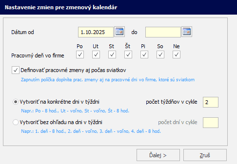 Ak zamestnanci budú mať definované zmeny aj počas víkendov, v riadku pracovný deň vo firme označíte všetky dni vrátane soboty a nedele. Ak zamestnanci budú mať definované zmeny aj počas sviatkov, označíte pole Definovať pracovné zmeny aj počas sviatkov.