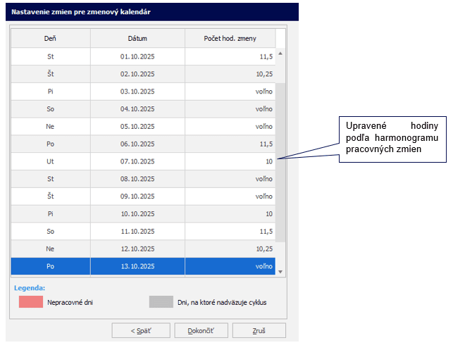 V tabuľke zadáte hodiny podľa rozvrhu pracovných zmien. Na dni, kedy má byť definovaná zmena, zadáte hodiny, na dni voľna zadáte nulu. Po presunutí sa do ďalšieho riadku sa zobrazí „voľno“. Nadefinované zmeny môžete následne vyberať aj pomocou šípky v príslušnom dni.