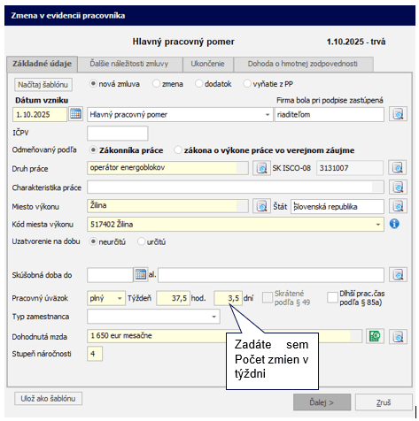 V úväzku vyberiete možnosť plný, prípadne prepočítaný úväzok podľa dohodnutého pracovného času. Do poľa počet hodín uvediete počet hodín podľa dohodnutého úväzku. Do poľa počet dní uvediete Počet zmien v týždni. Potvrdíte OK.