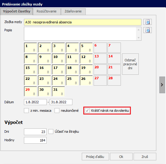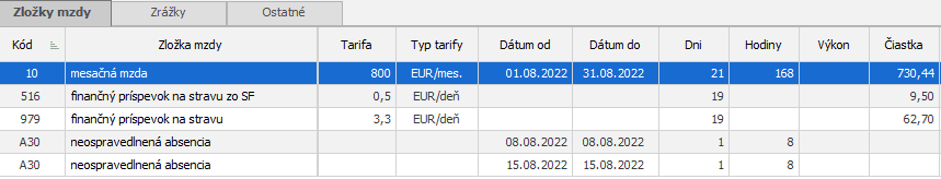 Ak má zamestnanec v rámci jedného mesiaca viac absencií, ktoré nenasledujú bezprostredne za sebou (napr. 8. 8. 2022 a 15. 8. 2022), absenciu zadáte do výplaty dvoma zložkami mzdy A 30 – neospravedlnená absencia.
