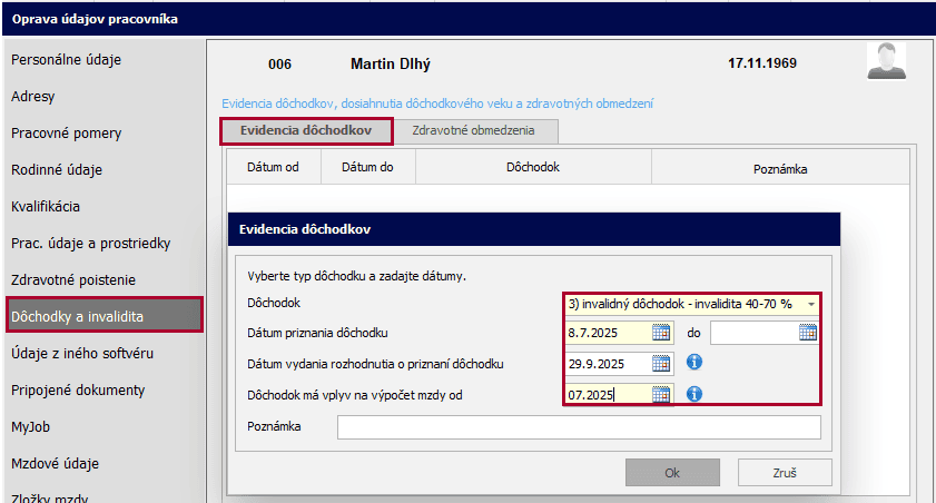 Zamestnali ste invalidného dôchodcu alebo zamestnanca so zdravotným obmedzením a potrebujete mu zaevidovať invalidný dôchodok alebo pokles schopnosti vykonávať zárobkovú činnosť? Uvedené skutočnosti môžu mať vplyv na výšku odvodov zamestnanca do Sociálnej a zdravotnej poisťovne a jednoducho ich zadáte v Personalistike na karte Dôchodky a invalidita.