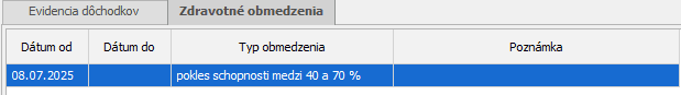 V prípade, že zadáte na záložke Evidencia dôchodkov invalidný dôchodok – invalidita 40 – 70 % alebo invalidný dôchodok – invalidita nad 70 %, program automaticky nastaví príslušný stupeň zdravotného obmedzenia na záložke Zdravotné obmedzenia.