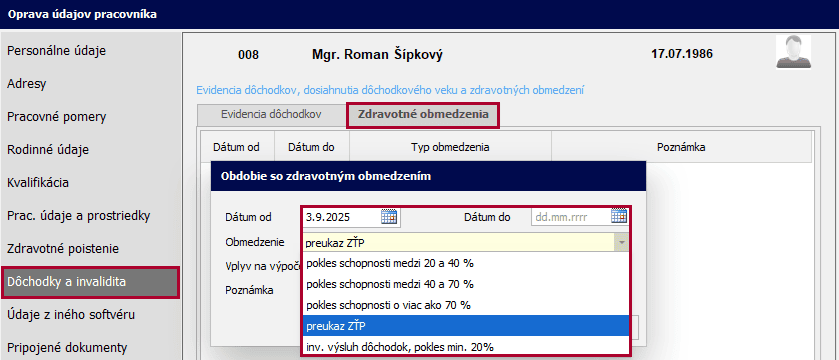 Ak by zamestnanec už nepoberal invalidný dôchodok (napr. z dôvodu, že mu vznikol nárok na poberanie starobného dôchodku), ale stále má zdravotné obmedzenie alebo je držiteľom preukazu ZŤP, zdravotné obmedzenie zaevidujete ručne. Vyplníte mesiac a rok odkedy má mať zdravotné obmedzenie vplyv na výpočet mzdy a vyberiete typ zdravotného obmedzenia.