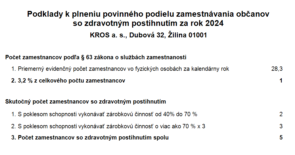 Ako pomôcka pri vytváraní elektronického ročného výkazu o plnení povinného podielu zamestnávania občanov so ZPS slúžia Podklady k plneniu povinného podielu zamestnávania občanov so zdravotným postihnutím. Dokument nájdete v menu Tlač – Tlač – Štatistika – Zamestnávanie občanov zo ZPS.