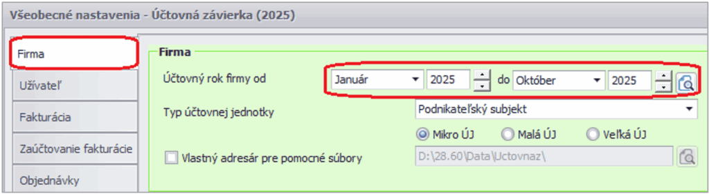 - Prostredníctvom menu Firma – Nastavenie – Všeobecné nastavenia skrátime účtovné obdobie do „Októbra“. Účtovné prípady za štyri novembrové dni – s dátumom od 1. 11. do 4. 11. zaevidujeme ešte s dátumom 31. 10., aby patrili do októbra. Následne vykonáme všetky uzávierkové operácie, závierku účtovníctva a prechod do ďalšieho roka. Všetky doklady s dátumom od 5. 11. budeme už potom účtovať v novom roku, s nastaveným obdobím od „Novembra 2025 do Decembra 2025“.