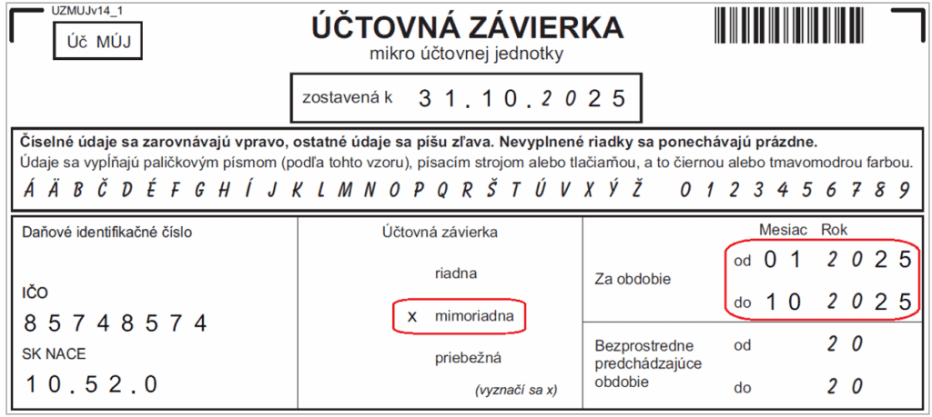 V programe Podvojné účtovníctvo OMEGA prostredníctvom menu Firma – Nastavenie – Všeobecné nastavenia skrátime účtovné obdobie z pôvodne zadaného obdobia od Januára do Decembra na obdobie „Január až Október“. Následne vykonáme všetky uzávierkové operácie a závierku účtovníctva, ako sa štandardne robia na konci účtovného obdobia, teda k 31.12. a podáme mimoriadnu účtovnú závierku.