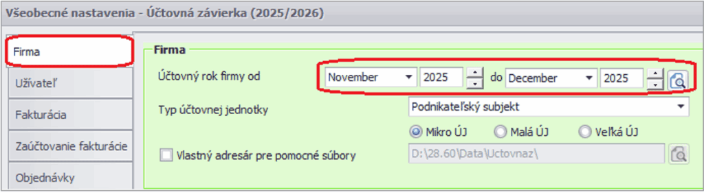 Po vykonaní všetkých uzávierkových operácií je potrebné urobiť prechod do ďalšieho roka, ktorý už bude rokom s nastaveným obdobím od Novembra 20205 do Októbra 2026. Tu je potrebné opäť skrátiť účtovné obdobie, aby sme účtovali v kalendárnom roku, to znamená, že v menu Firma – Nastavenie – Všeobecné nastavenia zmeníme účtovné obdobie na „November až December“.