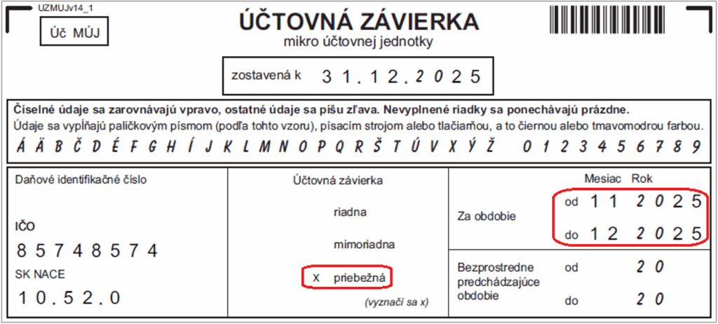 Ak by bola firma v likvidácii dlhšie ako jedno účtovné obdobie, na konci roka, teda k 31. 12. 2025, znovu uzavrieme účtovníctvo a vykonáme všetky uzávierky, závierku a prechod do ďalšieho roka. Ak obdobie likvidácie alebo konkurzu je dlhšie ako kalendárny rok alebo presahuje koniec kalendárneho roka (ako už bolo vyššie spomenuté), účtovná jednotka na účely určenia základu dane zostavuje priebežnú účtovnú závierku ku koncu každého kalendárneho roka, ktorá je súčasťou zdaňovacieho obdobia počas trvania likvidácie alebo konkurzu. V prípade, že likvidácia spoločnosti trvá viac kalendárnych rokov, tzn. že neskončí do 31. 12. druhého roku nasledujúceho po roku, v ktorom daňovník vstúpil do likvidácie, potom pre daňové účely zostavuje k 31. 12. každého kalendárneho roku počas trvania likvidácie priebežnú účtovnú závierku pre potreby podania daňového priznania na daň z príjmov.