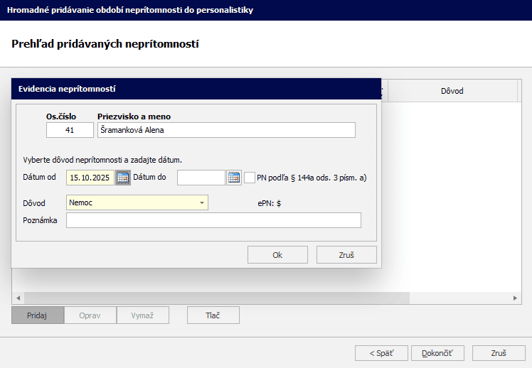 Výberom voľby Zadávanie neprítomnosti a kliknutí na Ďalej sa zobrazí formulár, kde cez Pridaj zadáte osobné číslo zamestnanca (meno a priezvisko sa doplnia automaticky) alebo si zo zoznamu vyberiete Priezvisko a meno zamestnanca a zadáte dátumy začiatku a konca PN, OČR alebo nejakú neprítomnosť. Po pridaní všetkých zamestnancov a stlačení tlačidla Dokončiť sa pridajú takto nadefinované neprítomnosti do Personalistiky – na kartu Evidencia neprítomnosti. Po vygenerovaní výplaty sa neprítomnosť prenesie príslušnými zložkami.