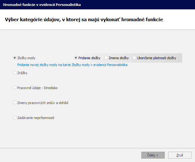 - Pridať novú zložku mzdy, zmeniť čiastku alebo tarifu už existujúcej zložky mzdy alebo ukončiť platnosť zložky mzdy