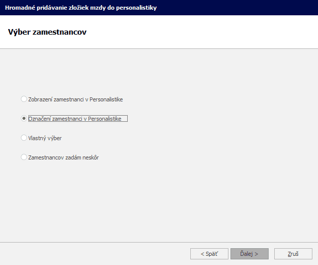 Po kliknutí na tlačidlo Ďalej sa zobrazí okno, kde je potrebné zvoliť, ktorým pracovníkom chcete pridať do Personalistiky zložku mzdy. Na výber máte z možností: