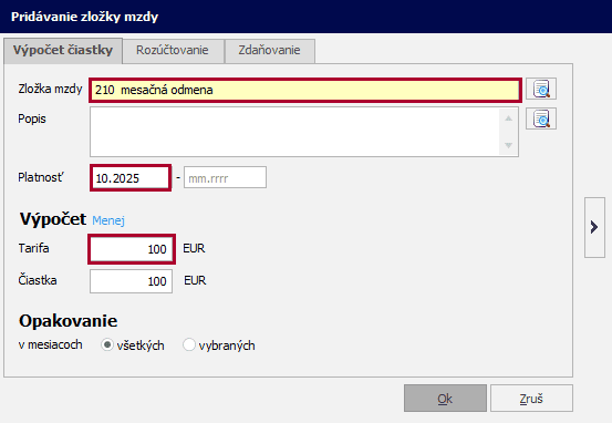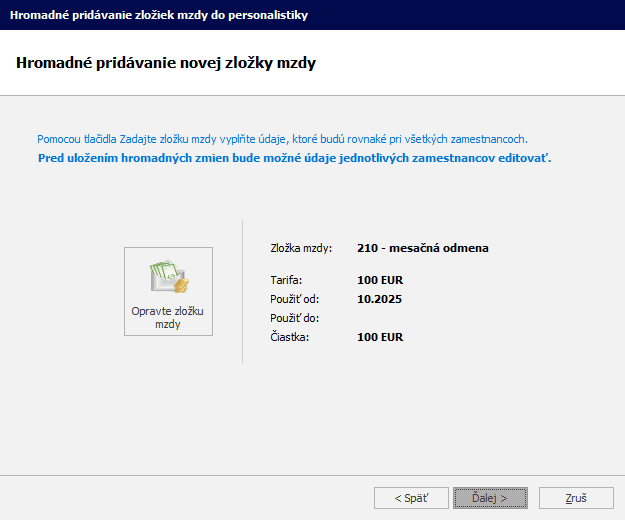 Po zvolení voľby „Označení zamestnanci v Personalistike“ a kliknutí na Ďalej sa zobrazí okno Pridávanie zložky mzdy. Kliknutím na Číselník v poli mzdová položka si v mzdovej osnove nájdete požadovanú zložku mzdy, v tomto prípade 210 – mesačná odmena. V zložke mzdy stačí uviesť výšku odmeny 100 Eur (v poli Tarifa) a do poľa Platnosť zadať 10.2025.