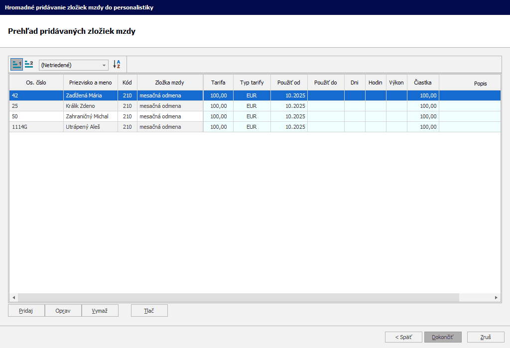 Po označení tlačidla Ďalej sa v okne zobrazia vami zvolení pracovníci. Ešte pred samotným potvrdením okna tlačidlom Dokončiť môžete pridať ďalšieho zamestnanca alebo z vybraných zamestnancov môžete niektorého vymazať. Taktiež je možné uvedené údaje jednotlivých zamestnancov editovať a Mzdy a personalistika prehľadne a spoľahlivo Informácie v dokumente sú spracované k právnemu stavu platnému ku dňu jeho publikácie. 03.06.2020 to prostredníctvom tlačidla Oprav alebo priamo v tabuľke. Pracovníkovi tak môžete zmeniť druh zložky mzdy, výšku tarify aj platnosť zložky mzdy.