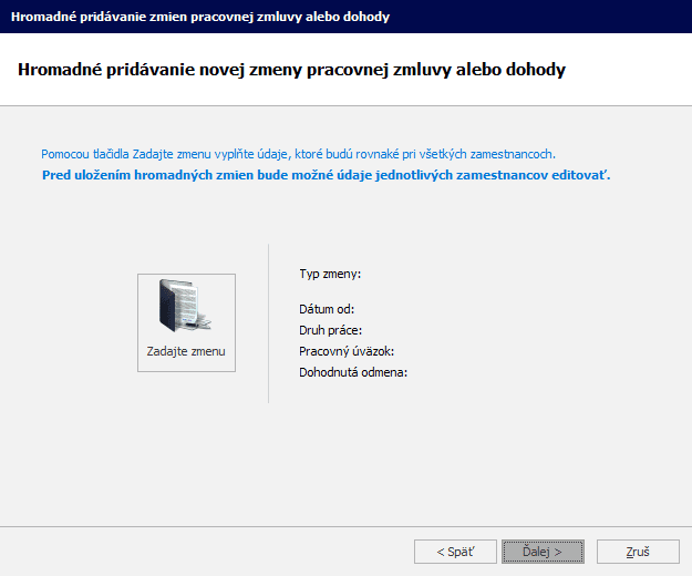 Umožňuje pridávať Zmeny pracovných zmlúv súčasne viacerým zamestnancom. Po označení voľby Zmeny pracovných zmlúv a dohôd máte možnosť zvoliť, ktorým pracovníkom (zobrazení alebo označení zamestnanci v Personalistike alebo označíte voľbu „zamestnancov zadám neskôr“) chcete pridať Zmenu PZ. Po kliknutí na Ďalej sa zobrazí prázdny formulár Zmena v evidencii pracovníka. Vo formulári stačí zadať dátum platnosti zmeny a vyplniť len tie údaje (polia), ktoré sa menia oproti údajom dohodnutým v pôvodnej pracovnej zmluve.