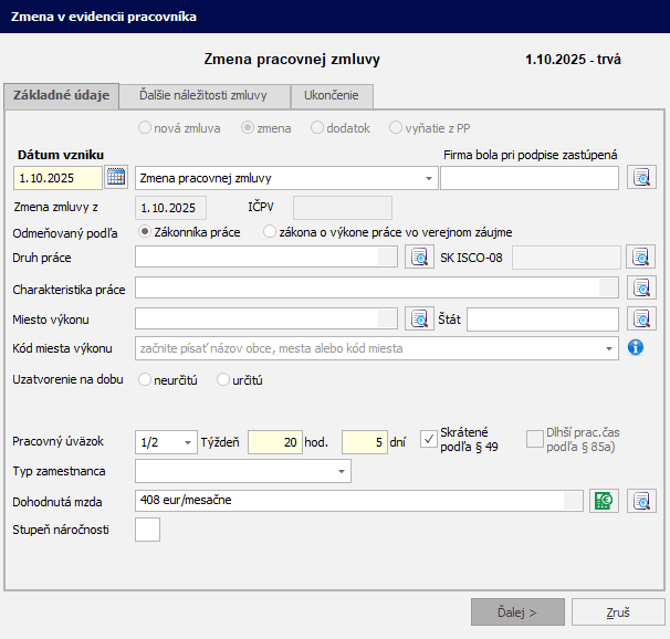 Od októbra 2025 chcete zamestnancom skrátiť pracovný úväzok z plného na polovičný a upraviť výšku mzdy, pričom druh práce, miesto výkonu práce a ostatné náležitosti zostávajú nezmenené, vyplňte len polia Dátum vzniku, Pracovný úväzok a Dohodnutá mzda.
