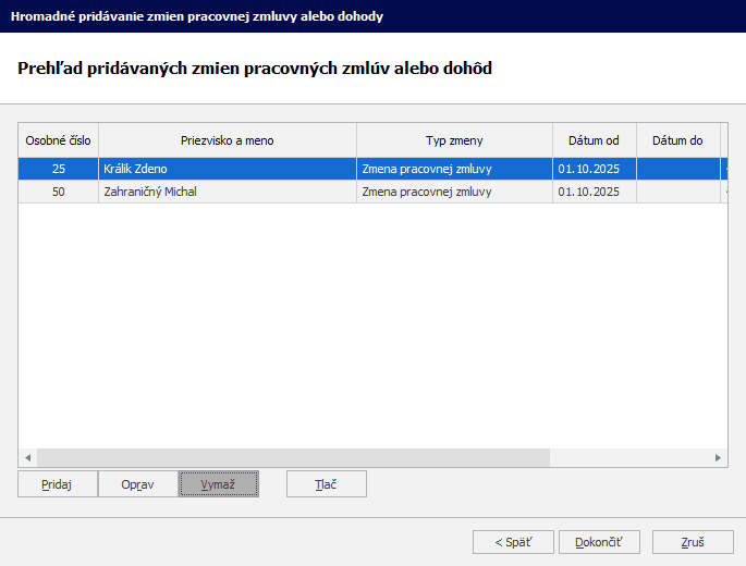 Po vyplnení a potvrdení zmeny PZ cez tlačidlo OK a stlačení tlačidla Ďalej sa v okne Hromadné pridávanie zmien pracovnej zmluvy alebo dohody zobrazia zamestnanci, ktorým pridávate Zmenu PZ. V uvedenom okne ešte môžete prostredníctvom tlačidla Oprav upravovať údaje v pridanej Zmene PZ.