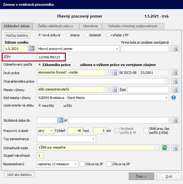 V prípade, že ste sa so zamestnancom dohodli na zmene podmienok (v OLYMPE zadávate zmenu pracovnej zmluvy), nie je potrebné meniť IČPV, počas trvania pracovného pomeru sa stále používa jedno IČPV.