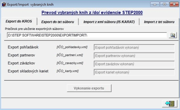 Ak máte verziu programu STEP2000 vydanú po 5. 12. 2023, pribudla Vám v programe možnosť Export do KROS, cez ktorú si viete do samostatných .xml súborov vyexportovať údaje o pohľadávkach, záväzkoch, partneroch a skladových kartách. Pre jednoduchšiu identifikáciu obsahuje ich názov IČO spoločnosti, z ktorej sa urobil export.