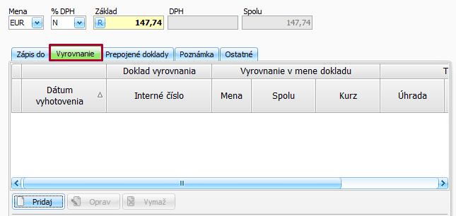 K zoznamu pohľadávok alebo záväzkov sa dostanete cez hlavné menu Evidencie – Pohľadávky alebo Evidencie – Záväzky. Príslušný doklad si otvorte dvojklikom alebo tlačidlom Oprav. Úhradu pridáte cez tlačidlo Pridaj na záložke Vyrovnanie.
