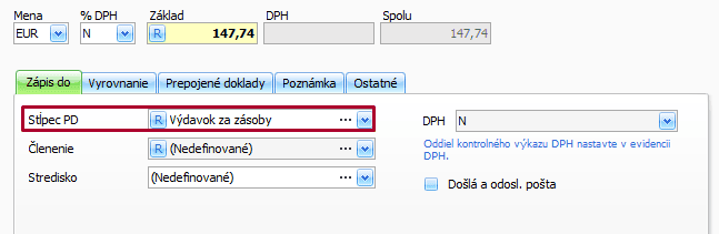 Na všetkých importovaných záväzkoch je prednastavené smerovanie úhrady do stĺpca peňažného denníka Výdavok za tovar. Zmenu môžete urobiť buď na doklade na záložke Zápis do alebo pri evidovaní úhrady do peňažného denníka