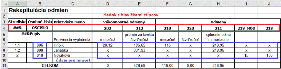 - v ostatných stĺpcoch kódy zložiek mzdy, ktoré sa budú importovať,