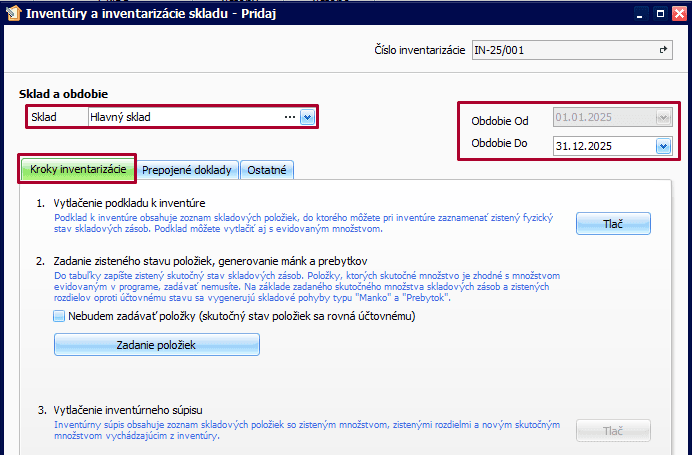 - Vyberte sklad, na ktorom bude vykonaná inventarizácia a obdobie inventarizácie, napr. od 1.1.2025 do 31.12.2025 pri ročnej inventarizácii.